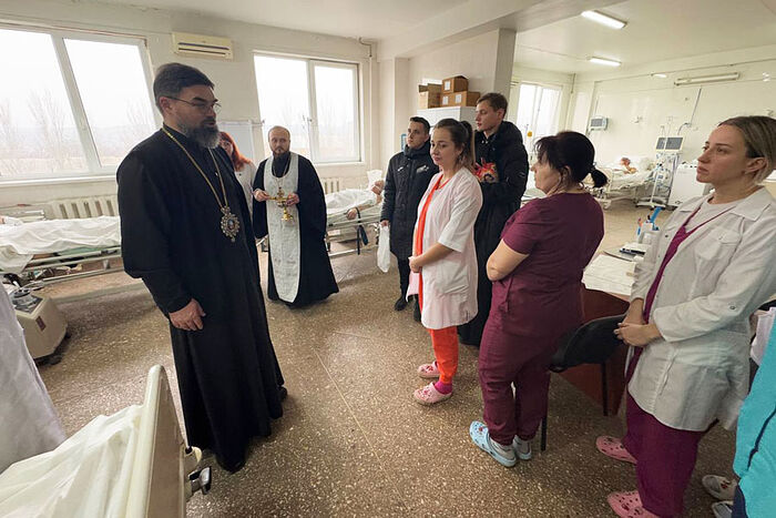 The staff of City Hospital No. 3 and patients of the hospice were congratulated on Christmas by Archimandrite Agafodor (Polyakov), responsible for hospital ministry in the Gorlovka diocese, Archpriest Vasily Odoviychuk, rector of the Cyril and Methodius Church in Gorlovka, and clerics of the Epiphany Cathedral. The clergy delighted the patients and medical staff with carols and sweet gifts from Metropolitan Mitrofan of Gorlovka and Slavyansk.