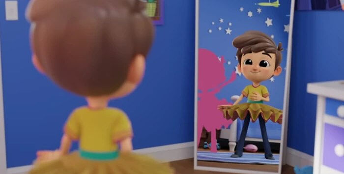 In one part of this piece, the main character, a little boy, says, "My heart sinks when I put on a dress," and he is pictured wearing a dress and looking in a mirror.