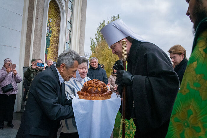 At the entrance to the temple the Ruling Hierarch was met by representatives of the public, parishioners of various churches of the city of Donetsk, numerous representatives of the media. Under the bell ringing Vladyka Vladimir was greeted by the Parish Council of the cathedral at the temple gate with traditional flowers, loaf and good wishes.