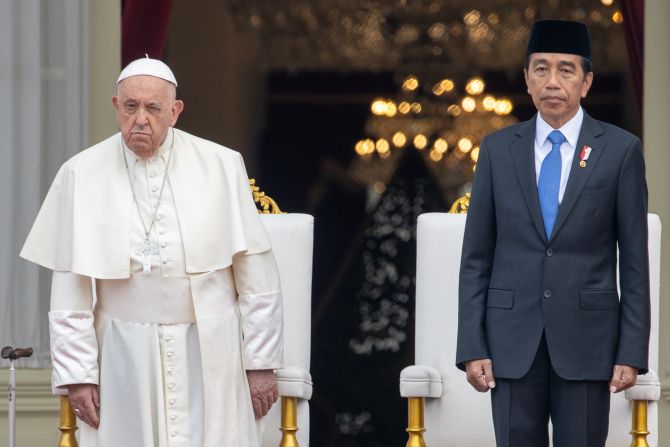 Children waved flags and cheered as the pope’s car approached the palace. The 87-year-old pope was then pushed in a wheelchair to the palace entrance, where he was received by President Joko Widodo and saluted by an honor guard dressed in red and white.