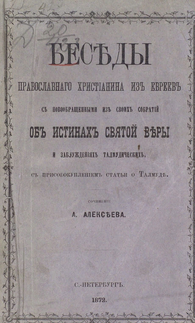 Беседы православного христианина из евреев с новообращенными из своих собратий об истинах святой веры и заблуждениях талмудических, с присовокуплением статьи о талмуде