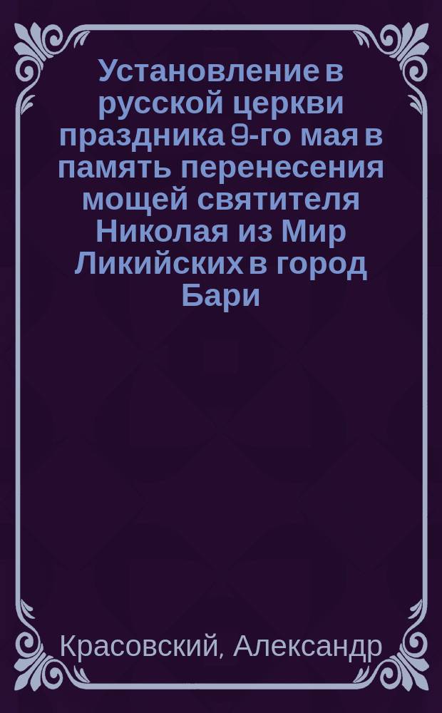 Установление в Русской Церкви праздника 9 мая, в память перенесения мощей св. Николая из Мир Ликийских в г. Бар