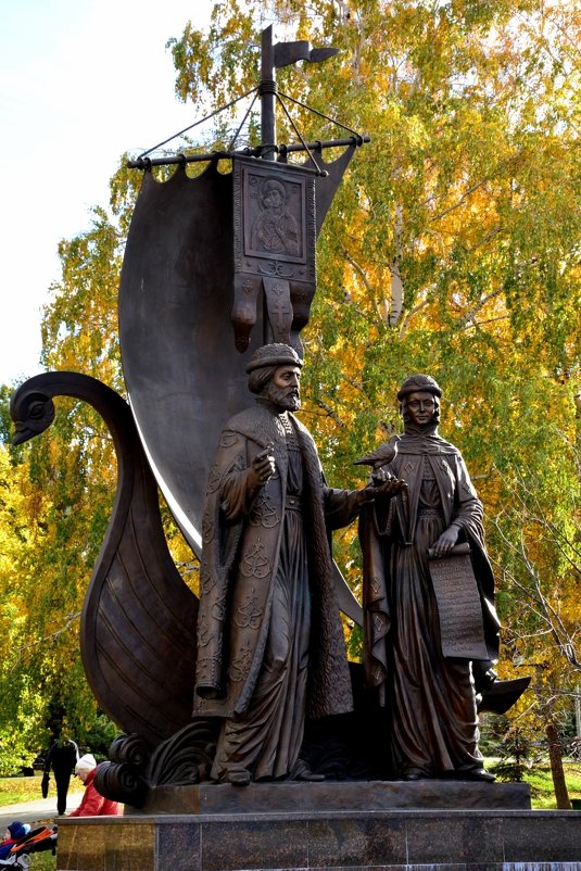 Автором памятника покровителям православной семьи стал скульптор Константин Чернявский. Святые благоверные Петр и Февронья стоят впереди ладьи, на которой поднят парус. Князь Петр держит обручальное кольцо, княгиня Февронья – голубку и развернутый свиток. На мачте ладьи – большая икона Божьей Матери.