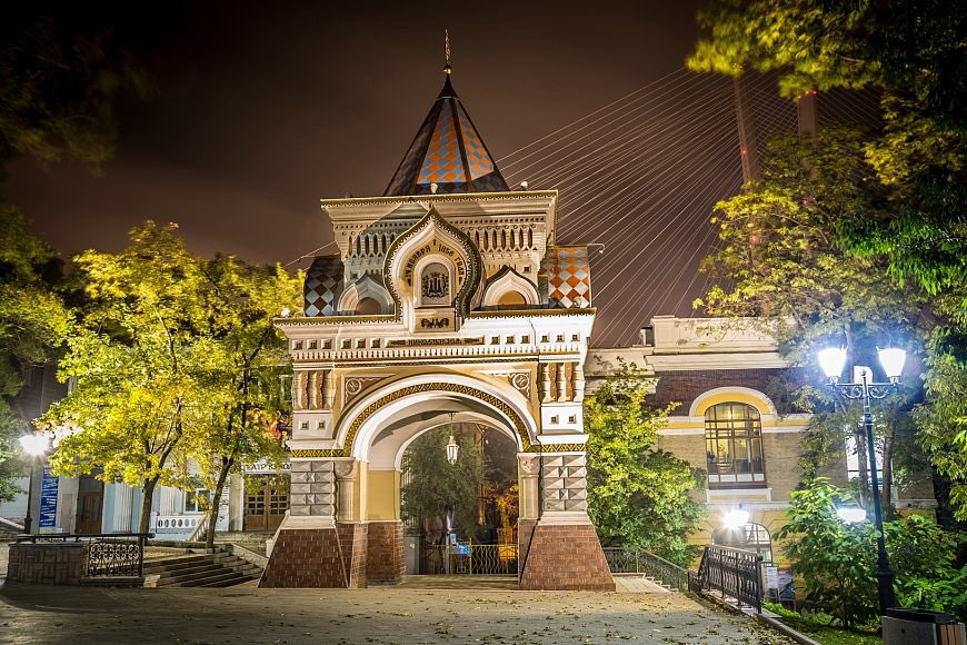 В 1891 году наследник престола Николай Александрович, возвращаясь из Восточного путешествия, должен был посетить Владивосток. К его приезду в городе по проекту военного архитектора капитана Н. В. Коновалова была возведена триумфальная арка в русско-византийском стиле, впоследствии получившая название Николаевской. Символическое сооружение имело четыре опоры, переходящие в кирпичные колонны-пилястры; на опорах покоились четыре стрельчатых арочных пролета – а вверху арки располагался шатровый купол с красно-синим шахматным орнаментом и государственным гербом – двуглавым золоченным орлом. Арка была прихотливо украшена декоративным узорьем в древнерусском стиле, «грановитым» рустом и кокошниками на куполе. В створе малой арки, обращенной к морю, находился мозаичный образ покровителя мореходов – святителя Николая Чудотворца – со словами молитвы «Правило веры и образ кротости» и датой прибытия цесаревича в город – 11.05.1891. С обратной стороны в такой же арке располагался герб Владивостока и дата присвоения ему статуса города. Еще две стороны сооружения имели изображения герба Приморской области с датой ее основания – и герба морской крепости Владивосток с датой присвоения ей этого статуса.