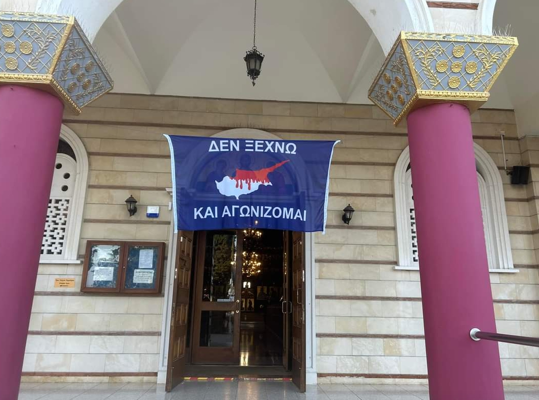 По инициативе Блаженнейшего Архиепископа Кипрского г-н. Георгиу, по случаю черной годовщины 50-летия вторжения и оккупации нашего острова был воспроизведен символический флаг, призванный напомнить нам о страданиях, которые переживает наша родина, и о долге сражаться до того дня. оправдания.