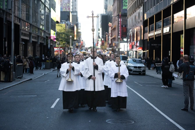 После мессы евхаристическая процессия прошла через несколько городских кварталов в одном из самых туристических районов Нью-Йорка, застопорив движение.