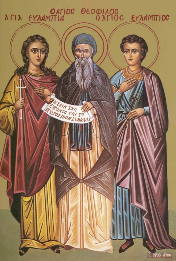 Сегодня Церковь чтит память святителей Евламбия и Евламбия автодельфийцев и 200 мучеников, упраздненных вместе с ними, а также святителя Феофила Исповедника, воспитанного на подлинных началах веры, избегающего искушения лицемерия и ложь. В молодости он посетил монаха Стефаноса, который расширил его духовный кругозор и научил его быть настоящим монахом вне всякого мирского мышления. С помощью родителей он построил монастырь на горе Селендио.