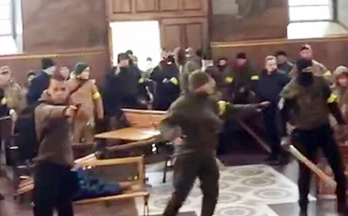 Как сообщалось ранее, прихожанам сегодня ночью удалось отстоять Архангело-Михайловский собор, когда около сотни человек в масках ворвались на его территорию во время Литургии. По данным журналистов, из храма была похищена казна, документы, компьютеры и иконы. Появились видео, на которых захватчики стреляют по прихожанам.