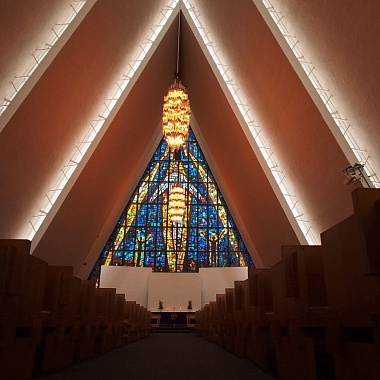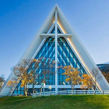 Решение о строительстве приходской церкви совет Тромсдалена (района Тромсё) принял в середине пятидесятых годов прошлого века. В 1957 году был выбран проект архитектора Яна Инге Ховига, который впоследствии подвергся некоторым изменениям. Интересно, что сам процесс строительства занял совесем немного времени: работы начались 1 апреля 1964 года — а 19 декабря 1965 года готовую церковь освятил архиепископ Монрад Нордервал. Церковь в Тромсё, рассчитанная на 720 прихожан, состоит из двух треугольных элементов, образованных 11 плитами из монолитного железобетона. Между собой плиты соединённы пластинами из алюминия с отверстиями между ними, сквозь которые внутрь проходит свет. Вот на что церковь в стиле модернизма действительно похожа, так это на айсберг. Кстати, цифра «3» обыгрывается в сооружении Арктического собора неоднократно: в треугольных формах самого здания, в витраже с тремя лучами света, исходящими из руки Господа Бога.Главный западный фасад собора — стена из стекла с 35-метровым бетонным крестом посередине.