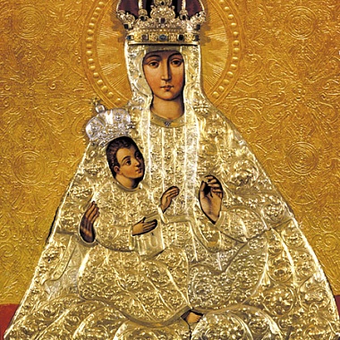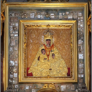 Интересно отметить, что икона, находящаяся в главном алтаре Тракайской базилики, за века пребывания в Литве была переписана. Проведённые реставраторами исследования показали, что изначально Пресвятая Дева была изображена на иконе в полный рост, с распущенными волосами и, вероятно, с венцом из роз на голове. По каким-то причинам впоследствии нижняя части иконы была обрезана, на фон заново нанесены резьба и позолота — а сам образ был написан заново в поясном варианте и несколько иной стилистике. Изображение Божией Матери с Младенцем Иисусом Христом украшено серебряным окладом с позолотой и золотыми коронами, дарованными, как уже было сказано, папой римским в XVIII веке. Тонкая резьба золотого фона была искусно снята с первоначальной иконы на рубеже XV-XVI веков — а затем, когда икону переписали, нанесена на неё заново.