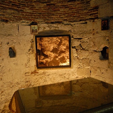 Археологически установлено, что небольшое углубление в скале, почитаемое как «могила Адама», в эпоху императора Адриана было закрыто опорной стеной и не могло служить объектом поклонения во II - нач. IV в. Строители эпохи императора Константина Великого разобрали стену на 70 см ниже совр. пола пещеры, но архитектурно ее не оформляли (закладка пещеры выходила в нее необработанной стороной). В письменных источниках часовня Адама у подножия скалы упоминается с VII в. Пещера была вырублена искусственно. Вход в пещеру прорублен через опорную кладку эпохи императора Константина, внутри она не оштукатурена и не имеет граффити раннехристианской эпохи.