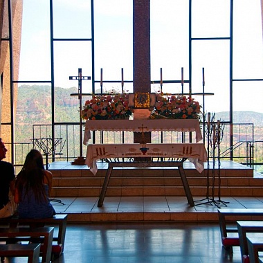 Если снаружи часовня выглядит более, чем необычно, то её интерьер - вполне традиционый для церквей Римской Католической Церкви. Ряды скамей по сторонам от центрального прохода, пара гобеленов на стенах, большой крест, являющийся центром внутреннего пространства... Тем не менее, и здесь есть одна характерная особенность, отличающая часовню от тысяч других, разбросанных по всему миру. Через огромные витажные окна любому пришедшему сюда открывается панорамный обзор на величественую долину со скалами красного цвета, простирающуюся на сотни километров.