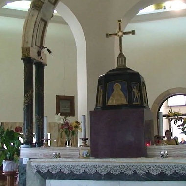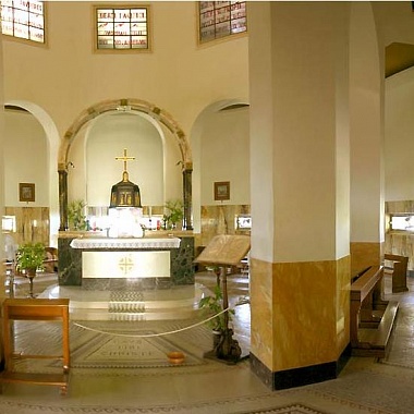 Однако вернемся в церковь Нагорной проповеди на горе Блаженств. В центре ротонды находится алтарь работы А. Миструции. Он выполнен из мрамора и отделан полудрагоценными камнями. Подняв голову вверх, можно увидеть крест, а также сцены Распятия и Вознесения Господня. А опустив взгляд вниз — различить символы семи добродетелей, которые подразумевают блаженства, перечисленные в Нагорной Проповеди. Это Справедливость, Доброта, Предусмотрительность, Вера, Смелость, Надежда и Скромность. Фигура Самого Изрекшего блаженства является своего рода центром композиции алтаря — изображение Спасителя заключено в овал, сделанный из оникса. На уровне окон на стенах помещены картины работы д’Аччиарди; на каждой — одна из остановок на Крестном Пути Сына Божьего, идущего на Голгофу... Мозаики на полу и золотую мозаику на куполе храма, кажется, можно разглядывать бесконечно.