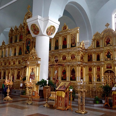 Не менее красив и интерьер собора. Центром внутреннего пространства является главный иконостас. Иконостасы боковых приделов будто перекликаются с ним, повторяя его форму. Главный престол собора освящён в честь чудотворной иконы Божией Матери «Казанская». Правый придел устроен во имя святого благоверного князя Александра Невского, а левый — в память о святых Царственных Страстотерпцах: последнем Императоре Российском Николае II, его августейшей супруге и детях. На нижнем уровне собора, под главным алтарём, располагается крестильный храм во имя святого равноапостольного князя Владимира — Крестителя Руси.