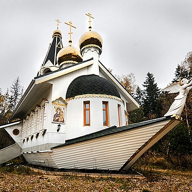 Известны миссионерские суда с храмами на них. Однако этот корабль — иного рода: он стоит на земле, но, благодаря искусно сделанной подсветке, кажется, что судно парит в воздухе.