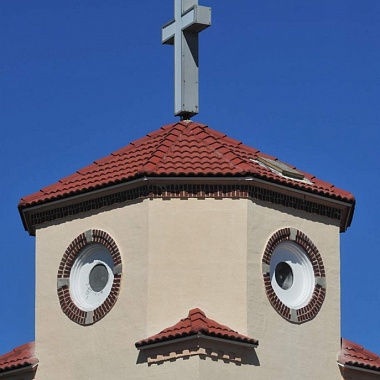 Всё дело в необычной форме этого дома молитвы, а если быть точным — его завершающей части. Верхний ярус постройки напоминает цыплёнка: круглые окна — глаза, красная плитка — клюв, крылышки, хвост и хохолок на голове. Завершено здание четырёхконечным крестом, снабжённым подсветкой, благодаря чему главный символ христианства отлично виден на фоне ночного неба. Сходство церкви с домашней птицей настолько явно, что в интернете у этого храма даже появился неофициальный фан-клуб.