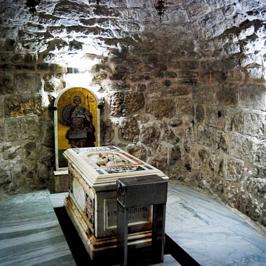 В крипте храма находится кенотаф — символическая могила святого Георгия. Крышку надгробия с барельефом великомученика духовенство регулярно умащает благовонным маслом. На стене крипты можно видеть великолепную мозаичную икону святого Георгия Победоносца, облачённого в доспехи, с сияющим нимбом вокруг головы.