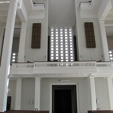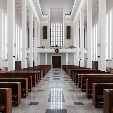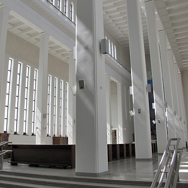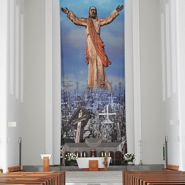 Интерьер храма выдержан в строгих светлых тонах. Алтарь украшают изображения Господа Иисуса Христа и Горы крестов в Шауляе (о ней мы отдельно расскажем в одной из наших следующих публикаций).