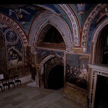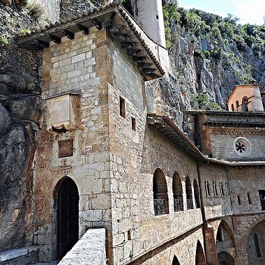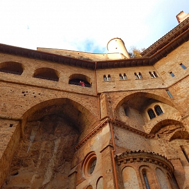 Но вернёмся к монастырю Сакро Спеко. Стоя на краю ущелья, он тесно прилегает к скале, будто врастая в неё. Часть помещений святой обители располагается в пещерах — они соединены друг с другом галереями, прорезанными в камне. Из окон келий монастыря святого Бенедикта открывается изумительный вид на окрестности — и на монастырь святой Схоластики.