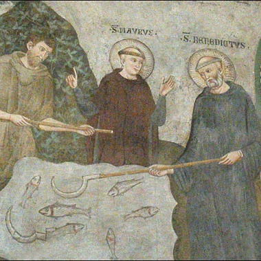 Место святого Бенедикта в центре этой скульптурной композиции объясняется его основополагающей ролью в становлении европейского монашеского жительства. До шестого века святых обителей, живущих по единому уставу, как в Палестине или Египте, на территории Европы не было. Именно святой Бенедикт упорядочил монашескую жизнь в этой части света, написав единый устав для западных монастырей. Но прежде, чем сделать это, ему самому нужно было пройти путём отшельнического жительства. Историю духовного подвига святого Бенедикта изложил в своих «Беседах о жизни и чудесах Италийских отцов» святой Григорий Двоеслов.