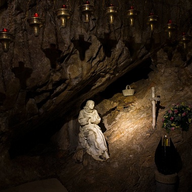 Паломники, пребывающие в Сакро Спеко, непременно стремятся посетить ту самую пещеру, где жил святой Бенедикт. Здесь установлена статуя святого, творящего молитву. Рядом — место, где он спал. Можно увидеть здесь и корзину, в которой спускал подвижнику пищу монах Роман — правда, уже не аутентиченую, а искусно высеченную из мрамора. Рядом с этой пещерой располагается другая — так называемый грот пастухов, где святой беседовал с приходящими к нему; здесь же его посетил святой Сильвестр, Римский Папа.