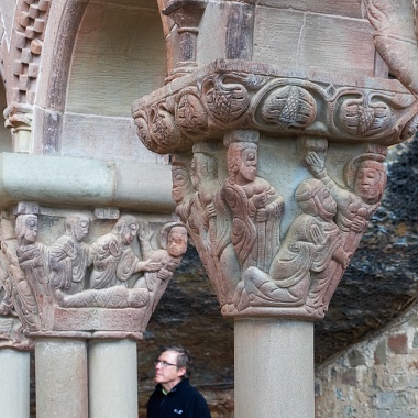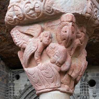 Возможно, более всего посетителей впечатляет уже упомянутый клуатр, окруженный аркадой, с нависающим над ним скалой. Очень интересны капители колонн: у всех, изображенных на них персонажах Священной истории, чрезмерно выпуклые, будто у насекомых глаза. Эта особенность позволяет узнать в архитектурных деталях работу безымянного «мастера из Агуэро», жившего в XII веке. Его стиль безошибочно узнаваем во множестве замечательных работ в храмах и монастырях на севере Арагона и Наварры.