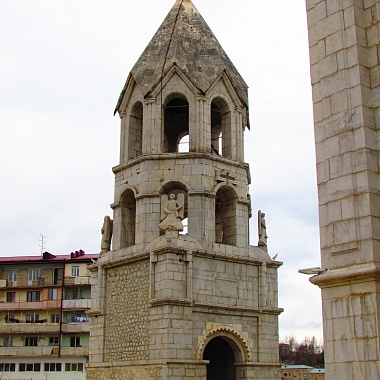 Колокольня находится в нескольких метрах от входа в собор с западной стороны. На углах первого яруса звонницы можно увидеть скульптурные изображения ангелов, с грозным видом дующих в трубы. Это копии: оригинальные скульптуры трубачей были разбиты в 1988 году, во время Карабахской войны, когда Шуши находился под контролем азербайджанской армии. Сам же собор во время оккупации использовался как склад боеприпасов. В 1992 году город был освобождён, после чего немедленно началась реставрация исторического храма, которая заняла шесть лет. Именно тогда вместо разбитых трубачей и были установлены новые. (Кстати, точно такую же трубящую ангельскую фигуру можно увидеть и на гербе города Шуши.) Орнаментированный пояс колокольни — один из замечательных образцов армянской национальной резьбы по камню.