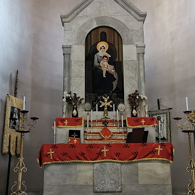 По обе стороны от входа в церковь Сурб-Аставацацин находятся хачкары — памятные камни с резными крестами. Здесь же можно увидеть и архитектурно-художественные фрагменты, сохранившиеся от прежнего храма.
