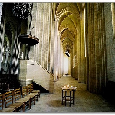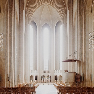 Интересно, что неф церкви Грундтвига представляет собой модель четырёхмачтового судна, сошедшего с верфей Глазго в 1903 году. Его точная копия в масштабе 1:35, сделанная в 1939 году капитаном Алмстедом, была подарена им копенгагенскому храму. Вообще же помещать в храмах модели парусных кораблей — очень давняя датская традиция; она основывается на древнем христианском понимании Церкви как корабля спасения в море мирских бурь.