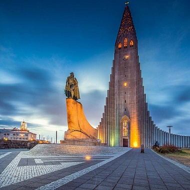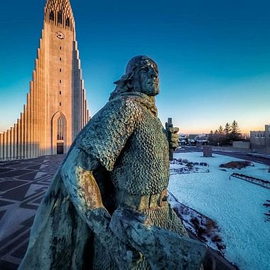 Впрочем, более ранняя история Исландии здесь также не оставлена без внимания. Прямо перед Хадльгримскиркьей установлено скульптурное изображение Лейфура Эрикссона или Лейва Счастливого — человека, который был первым европейцем, посетившим Американский континент. Произошло это за полтысячи лет до Колумба — при этом Лейв Эрикссон пристал к восточному побережью Америки намного севернее — на территории, принадлежащей сегодня Канаде. Сколько всего таких морских походов предприняли исландцы — достоверно неизвестно, однако до сего дня на американском континенте время от времени обнаруживают всё новые свидетельства его посещения европейцами. Что же касается статуи первооткрывателя Лейва Эрикссона, её Рейкьявику в 1930 году подарило правительство Соединённых Штатов Америки к 1000-летнему(!) юбилею Альтинга — исландского парламента, старейшего в Старом Свете.