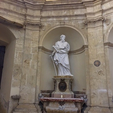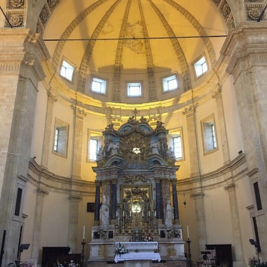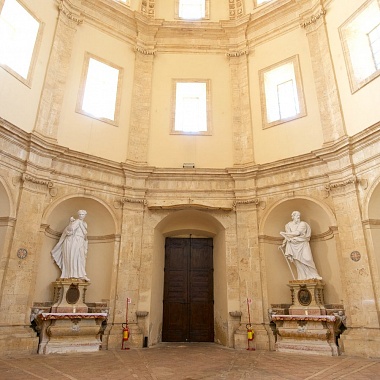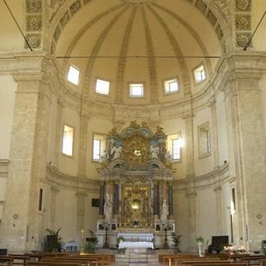 Церковь построена в виде греческого креста. Венчают её пять куполов: один центральный — и по одному, поменьше, над каждой из апсид. Интерьер храма очень лаконичен. Внутри можно увидеть двенадцать больших и очень выразительных статуй святых апостолов Господа Иисуса Христа — а также деревянную скульптуру папы римского Мартина I, уроженца здешних мест. В северной апсиде церкви, рядом с алтарём, выполненным в стиле барокко, находится скульптура Пресвятой Девы Марии, которая почитается как чудотворная.