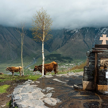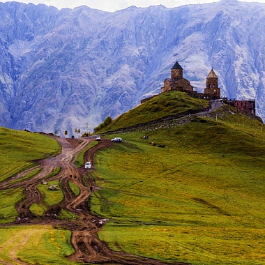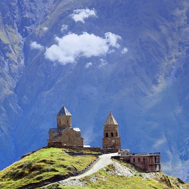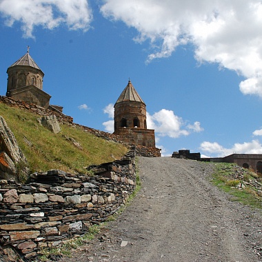 «Туда б, в заоблачную келью, В соседство Бога скрыться мне!», — восклицает в своем стихотворении «Монастырь на Казбеке» русский классик Александр Сергеевич Пушкин. В Грузии хорошо знают, что эти строки посвящены церкви Троицы в Гергети, на самом деле располагающейся выше облаков, на отметке 2170 метров над уровнем моря. Если смотреть снизу, кажется, что средневековый храм будто парит в воздухе. Гергетская церковь расположена всего в 11 километрах от российско-грузинской границы — таким образом, это первая святыня, которую видят въезжающие в страну через Верхний Ларс паломники и туристы. Сам храм стоит возле селения Гергети — а ниже находится посёлок Степанцминда, ранее называвшийся Казбеги: на этот живописный населённый пункт со смотровой площадки сверху открывается завораживающий вид.