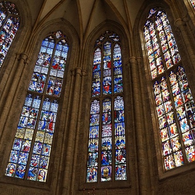 Внутреннее пространство собора украшают готические витражи. Шесть из девяти оригинальных витражей сохранились со времён средневековья. Старейший из них, сделанный в 1385 году на средства гильдии ткачей, изображает Деву Марию с Её матерью, праведной Анной — а также включает в себя сцены Рождества и детских лет Того, кто принёс спасение миру.