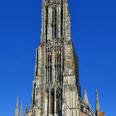 Возобновилось строительство только три века спустя. В 1844 году конструкцию здания укрепили, наконец достроили не завершённые прежде башни за хорами— а затем, в 1890 году, принялись достраивать и главную башню. Через десять лет её высота по верхушке шпиля достигла 161,5 метра и остается такой по сей день. Это самая высокая колокольня в мире, и любой желающий может подняться на её смотровую площадку, находящуюся на высоте 143 метра, преодолев 768 ступеней. Отсюда можно разглядеть не только город с окрестностями, но в хорошую погоду даже Альпийские горы вдалеке.