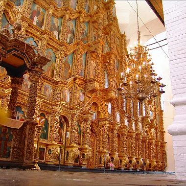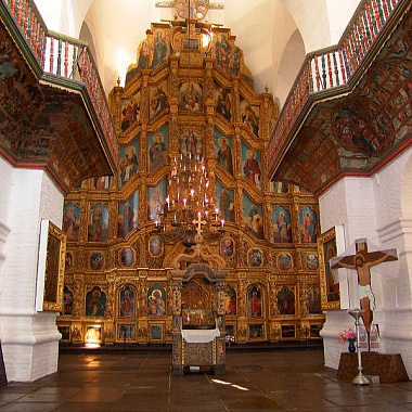 Если внешний вид собора аскетичен, то его интерьер, напротив, поражает своим убранством. Покрытый позолотой пятиярусный резной иконостас размером 19 на 23 метра включает в себя 149 икон середины восемнадцатого столетия, значительная часть которых была написана московским иконописцем Егором Греком и мастерами его артели. Лики на святых образах высветлены на тёмном фоне; проработка деталей одежд выполнена с использованием позолоты. Вообще же каждая мелкая деталь на иконах, включая пейзажные фоны, тщательно выписана.