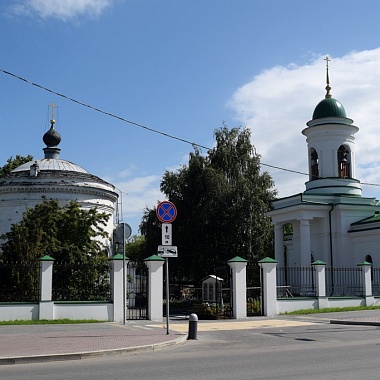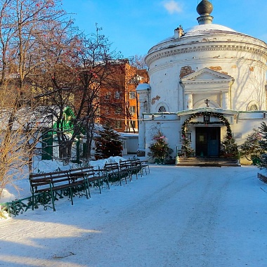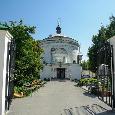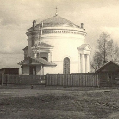 Первый храм на месте этого необычного дома молитвы появился ещё в 1779 году. Был он, как и большинство городских построек того времени, деревянным — и, несмотря на неусыпную заботу о нём городских властей, уже к 30-м годам XIX века сильно обветшал. По этой причине в 1833 году на его месте был заложен новый, каменный храм. Инициатором строительства кладбищенской (к подворью храма примыкал погост) церкви был титулярный советник Дмитрий Войнов, а автором проекта храма стал архитектор Парамон. Его проект был нетипичным решением для православных церквей не только в Сибири, но и в России вообще. К круглому зданию в форме ротонды с пологим сводчатым куполом примыкали четыре двухколонных портика. Вокруг всей церкви шёл карниз, а купол венчала сферическая позолоченная главка с деревянным, обитым металлом крестом. Оформление интерьера храма выполнил сын упомянутого Дмитрия Войнова — коллежский советник Матвей Войнов. Строительные и отделочные работы заняли около пяти лет — и, наконец, в 1838 году новый Всехсвятский храм был освящен.