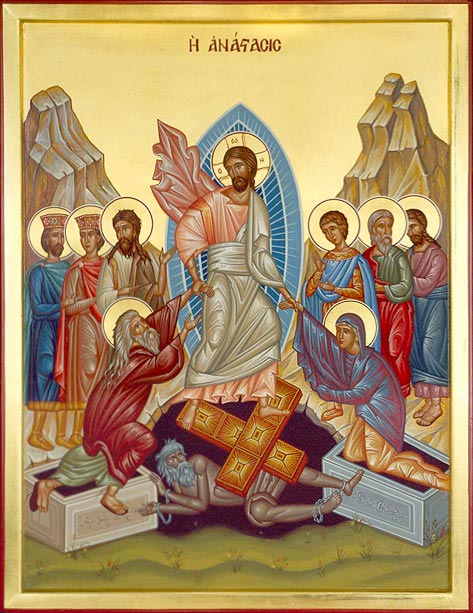 (Деян.1:1–8; Ин.1:1–17) Пасха, Господня Пасха! От смерти к жизни привел нас Господь Своим Воскресением. И вот Воскресение это «ангелы поют на небеси», увидев светлость обоженного естества человеческого в предопределенной ему славе в лице Господа Искупителя, во образе коего силою Воскресения Его, имели претвориться все истинно верующие в Него и прилепляющиеся к Нему вседушно. Слава, Господи, преславному Воскресению Твоему! Ангелы поют, сорадуясь нам и предзря восполнение сонма своего; нас же сподоби, Господи, Тебя, Воскресшего, чистым сердцем славить, видя в Воскресении Твоем пресечение снедающего нас тления, засеменение новой жизни пресветлой и зарю будущей вечной славы, в которую предтечею вошел Ты Воскресением нас ради. Не человеческие только, но вместе и ангельские языки не сильны изъяснить неизреченную Твою к нам милость, преславно Воскресший Господи!