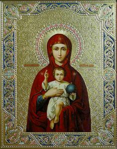 О, Чу́дная и вы́шшая все́х тва́рей Цари́це Богоро́дице, Небе́снаго Царя́ Христа́ Бо́га на́шего Ма́ти! Услы́ши ны́ гре́шныя и недосто́йныя рабы́ Твоя́, в ча́с се́й моля́щияся и припа́дающия к Тебе́ со воздыха́нием и слеза́ми и уми́льно глаго́лющия: изведи́ на́с от ро́ва страсте́й, Влады́чице, изба́ви на́с от вся́кия ско́рби и печа́ли, огради́ от вся́кия напа́сти и злы́х клеве́т и от непра́веднаго и лю́таго наве́та вра́жия. Мо́жеши бо, о, Благода́тная Ма́ти Бо́жия, не то́чию от вся́каго зла́ сохрани́ти лю́ди Твоя́, но и вся́ким благодея́нием снабди́ти и́х и спасти́, ра́зве Тебе́ ины́я Предста́тельницы в беда́х и обстоя́ниих и те́плыя Хода́таицы о на́с гре́шных не и́мамы к Сы́ну Твоему́, Христу́ Бо́гу на́шему. Его́же умоли́, Влады́чице, да, спасе́ннии Тобо́ю, сла́вим в бу́дущем ве́це всесвято́е и́мя Сы́на Твоего́ и Бо́га на́шего, ку́пно со Отце́м и Святы́м Ду́хом, ны́не и в безконе́чныя ве́ки. Ами́нь.