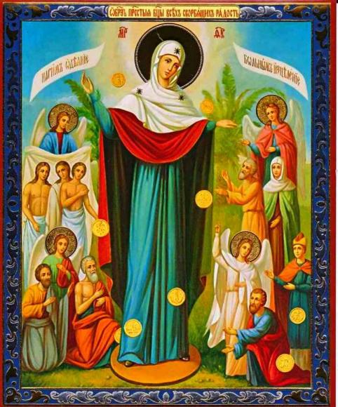О, Пресвятая Владычице Богородице, Преблагословенная Мати Христа Бога Спасителя нашего, всех скорбящих Радосте, больных посещение, немощных покрове и заступнице, вдовиц и сирых покровительнице, матерей печальных всенадежная утешительнице, младенцев немощных крепосте, и всем беспомощным всегда готовая помоще и верное прибежище! Тебе, о, Всемилостивая, дадеся от Всевышняго благодать во еже всех заступати и избавляти от скорби и болезней, зане Сама лютыя скорби и болезни претерпела еси, взирающи на вольное страдание Сына Твоего возлюбленнаго и Того на кресте распинаема зрящи, егда оружие Симеоном предреченное сердце Твое пройде. Темже убо, о Мати чадолюбивая, вонми гласу моления нашего, утеши нас в скорби сущих, яко верная радости Ходатаица: предстоящи престолу Пресвятыя Троицы, одесную Сына Твоего, Христа Бога нашего, можеши, аще восхощеши, вся нам полезная испросити. Сего ради с верою сердечною и любовию от души припадаем к Тебе яко Царице и Владычице и псаломски вопити Тебе дерзаем: слыша, Дщи, и виждь, и приклони ухо Твое, услыши моление наше, и избави нас от обстоящих бед и скорбей; Ты бо прошения всех верных, яко скорбящих радость, исполняeши, и душам их мир и утешение подавши. Се зриши беду нашу и скорбь: яви нам милость Твою, посли утешение уязвленному печалию сердцу нашему, покажи и удиви на нас грешных богатство милосердия Твоего, подаждь нам слезы покаяния ко очищению грехов наших и утолению гнева Божия, да с чистым сердцем, совестию благою и надеждою несумненною прибегаем ко Твоему ходатайству и заступлению: приими, всемилостивая наша Владычице Богородице, усердное моление наше Тебе приносимое, и не отрини нас, недостойных, от Твоего благосердия, но подаждь нам избавление от скорби и болезни, защити нас от всякаго навета вражия и клеветы человеческая, буди нам помощница неотступная во все дни жизни нашея, яко да под Твоим матерним покровом всегда пребудем цели и сохранена Твоим заступлением и молитвами к Сыну Твоему и Богу Спасителю нашему, Ему же подобает всякая слава, честь и поклонение, со безначальным Его Отцом и Святым Духом, ныне и присно и во веки веков. Аминь.