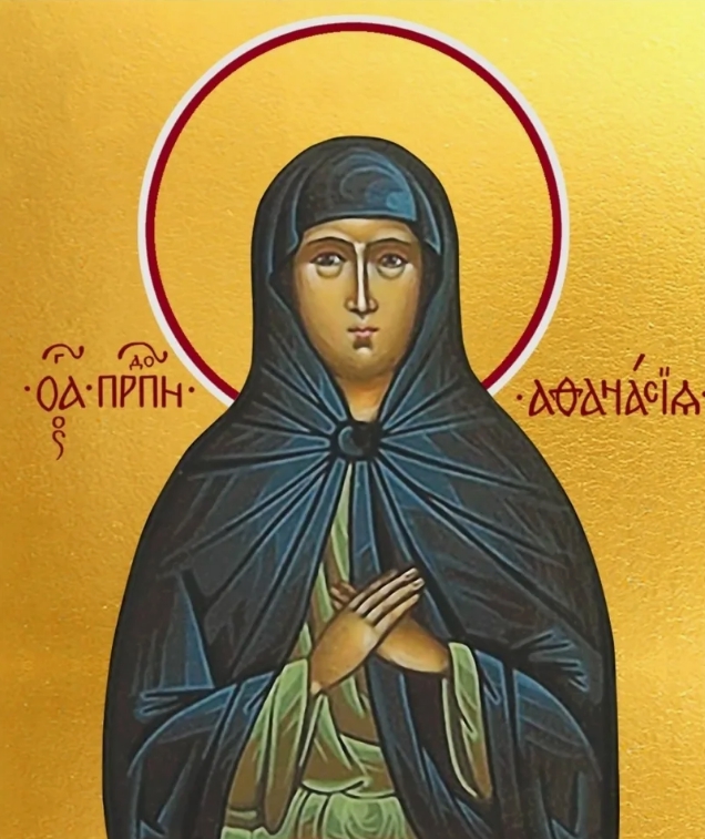 Тропарь: В тебе, мати, известно спасеся еже по образу: приимши бо крест, последовала Христу, и деющи учила еси презирати убо плоть, преходит бо: прилежати же о души, вещи безсмертней: тем же и со ангелы срадуется, преподобная Афанасия, дух твой. Кондак: За любовь Господню, преподобная, покоя желание возненавидела еси, пощением дух твой просветивши: крепко бо звери победила еси: но молитвами твоими противных шатание разори.