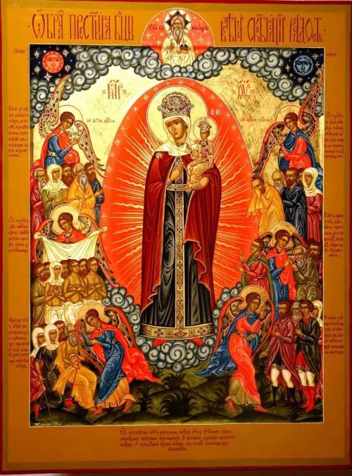 О, Пресвятая Владычице Богородице, Преблагословенная Мати Христа Бога Спасителя нашего, всех скорбящих Радосте, больных посещение, немощных покрове и заступнице, вдовиц и сирых покровительнице, матерей печальных всенадежная утешительнице, младенцев немощных крепосте, и всем беспомощным всегда готовая помоще и верное прибежище! Тебе, о, Всемилостивая, дадеся от Всевышняго благодать во еже всех заступати и избавляти от скорби и болезней, зане Сама лютыя скорби и болезни претерпела еси, взирающи на вольное страдание Сына Твоего возлюбленнаго и Того на кресте распинаема зрящи, егда оружие Симеоном предреченное сердце Твое пройде. Темже убо, о Мати чадолюбивая, вонми гласу моления нашего, утеши нас в скорби сущих, яко верная радости Ходатаица: предстоящи престолу Пресвятыя Троицы, одесную Сына Твоего, Христа Бога нашего, можеши, аще восхощеши, вся нам полезная испросити. Сего ради с верою сердечною и любовию от души припадаем к Тебе яко Царице и Владычице и псаломски вопити Тебе дерзаем: слыша, Дщи, и виждь, и приклони ухо Твое, услыши моление наше, и избави нас от обстоящих бед и скорбей; Ты бо прошения всех верных, яко скорбящих радость, исполняeши, и душам их мир и утешение подавши. Се зриши беду нашу и скорбь: яви нам милость Твою, посли утешение уязвленному печалию сердцу нашему, покажи и удиви на нас грешных богатство милосердия Твоего, подаждь нам слезы покаяния ко очищению грехов наших и утолению гнева Божия, да с чистым сердцем, совестию благою и надеждою несумненною прибегаем ко Твоему ходатайству и заступлению: приими, всемилостивая наша Владычице Богородице, усердное моление наше Тебе приносимое, и не отрини нас, недостойных, от Твоего благосердия, но подаждь нам избавление от скорби и болезни, защити нас от всякаго навета вражия и клеветы человеческая, буди нам помощница неотступная во все дни жизни нашея, яко да под Твоим матерним покровом всегда пребудем цели и сохранена Твоим заступлением и молитвами к Сыну Твоему и Богу Спасителю нашему, Ему же подобает всякая слава, честь и поклонение, со безначальным Его Отцом и Святым Духом, ныне и присно и во веки веков. Аминь.