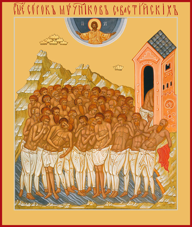 О, святии славнии страстотерпцы Христовы, четыредесяте, во граде Севастии Христа ради мужественно пострадавши, через огонь бо и воду проидосте и, яко друзи Христовы, в покой Небеснаго Царствия вшедше, имате велие дерзновение ко Пресвятей Троице ходатайствовати о роде христианском, наипаче же о почитающих святую память вашу и с верою и любовию вас призывающих. Испросите у Всещедрого Бога прощение согрешений наших и жития нашего исправление, да в покаянии и нелицемерной любви друг ко другу поживше, со дерзновением предстанем Страшному Судищу Христову и вашим предстательством одесную Праведнаго Судии предстанем.