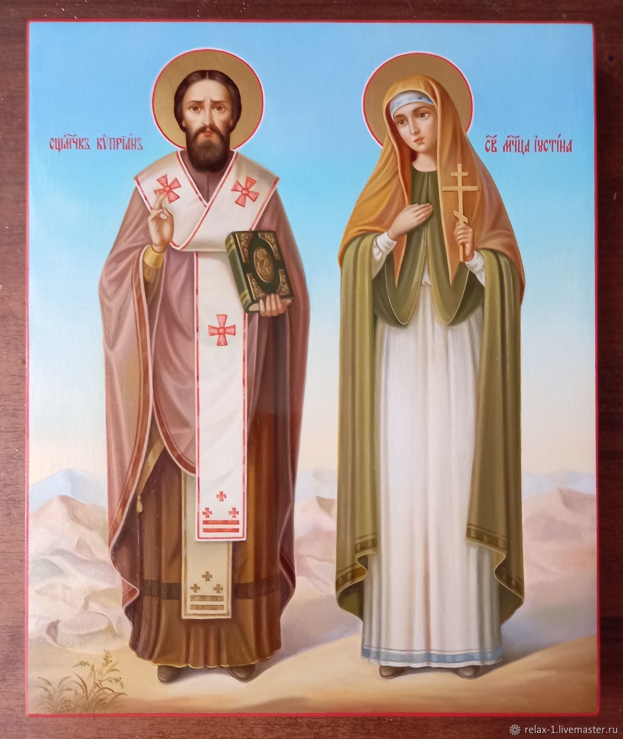 О святие священномучениче Киприане и мученице Иустина! Внемлите смиренному молению нашему. Аще бо временное житие ваше мученически за Христа скончали есте, но духом от нас не отступаете есте, присно по заповедем Господним шествовати нас научающе и крест свой терпеливо нести нам пособствующе. Се, дерзновением ко Христу Богу и Пречистей Его Матери стяжали есте. Темже и ныне будите молитвенницы и ходатаи о нас недостойных (имена). Будите нам заступницы крепции, да заступлением вашим сохраняеми невредимы, от бесов, волхвов и от человек злых пребудем, славяще Святую Троицу, Отца и Сына и Святаго Духа, ныне и присно и во веки веков. Аминь.
