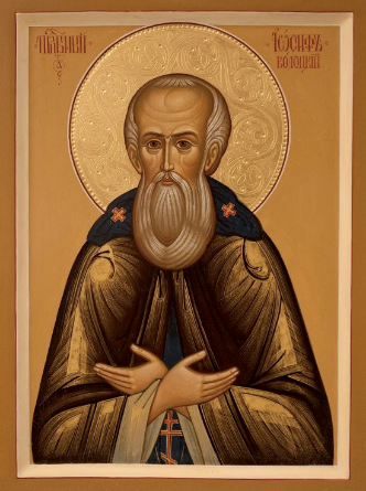 Преподобный Иосиф родился в 1440 году, близ Волоколамска. Двадцати лет от роду принял монашество и подвизался сначала в Пафнутиевом Боровском монастыре, а потом основал свой монастырь на родине своей, в Волоколамске. Преподобный Иосиф непримиримо обличал ересь «жидовствующих» и написал против них книгу под названием «Просветитель», он был мудрым строителем монастырской жизни, руководствуясь во всем непогрешимыми правилами Святой Церкви. Скончался в 1515 году.   Молитва О великий наставниче, ревнителю и учителю Православныя веры, святе премудре Иосифе! Приими моление, от нас, грешных, к тебе приносимое, и теплым предстательством умоли в Троице славимаго Бога, да ниспослет Он богатыя Своя милости нам, грешным: да утвердит во Святей Своей Православней Церкви правую веру и благочестие: пастырем ея да подаст святую ревность о спасении словеснаго стада, яко да верующих соблюдут, неверующих же и отпадших от истинныя веры вразумят и обратят. Всем же нам испроси вся благопотребная во временном сем житии и полезная к вечному спасению нашему. Помяни стадо свое, еже собрал еси, не забуди посещати чад своих и, яко чадолюбивый отец, не презри, ниже отрини моления наша, но воздежи руце свои молитвенней ко Господу Богу, да отложит праведный гнев Свой движимый на ны и избавит нас от враг видимых и невидимых, от глада, потопа, меча, смертоносныя язвы, нашествия иноплеменных и междоусобныя брани. Ей, премилосердый заступниче наш, преславный чудотворче, всех нас управи в мире и покаянии скончати живот наш и преселитися со упованием в блаженная недра Авраамова, идеже непрестанно славословится всепетое имя Отца и Сына и Святаго Духа. Аминь. (Из акафиста)