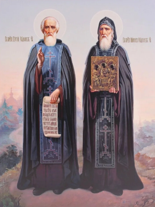Яко трисветлаго солнца светозарный звезды,/ Троическим светом озаряете сердца верных,/ сосуда Света Пресвятыя Троицы явльшеся,/ и предивным вашим житием иноком бысте твердии законоположителие/ и церквам благолепие, и благоверным, и святителем, и всем людем,/ вся бо демонския скверны отгнавше отсюду/ вашими чистыми учении и делы,/ добре упасосте стадо, собранное вами,/ но и ныне молим вас:/ посещайте чад своих, яко имущий дерзновение ко Святей Троице,/ Богомудре Сергие с чудным учеником своим Никоном,/ и молите Христа Бога, да спасет души наша.