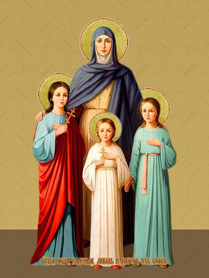 О святыя и достохвальныя мученицы Веро, Надеждо и Любы, и доблестных дщерей мудрая мати Софие, к вам ныне притецем со усердною молитвою; что бо паче возможет предстательствовати за ны пред Господем, аще не вера, надежда и любы, три сия краеугольныя добродетели, в нихже образ нареченныя, самою вещию тыя явисте! Умолите Господа, да в скорбех и напастех неизреченною благодатию Своею покрыет ны, спасет и сохранит, яко благ есть и Человеколюбец. Того славу, яко солнце незаходимое, ныне зряще светолепну, споспешествуйте нам во смиренных молениих наших, да простит Господь Бог грехи и беззакония наша, и да помилует нас грешных и недостойных щедрот Его. Молите убо о нас, святыя мученицы, Господа нашего Иисуса Христа, Емуже славу возсылаем со Безначальным Его Отцем и Пресвятым и Благим и Животворящим Его