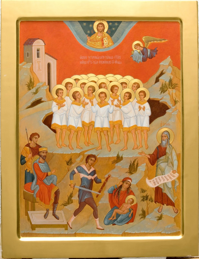 Как сообщает Евангелие от Матфея (Мф. 2, 1-12), Ирод, узнав от волхвов время рождения Младенца, замыслил убить Его и сказал восточным мудрецам: «пойдите, тщательно разведайте о Младенце и, когда найдете, известите меня, чтобы и мне пойти поклониться Ему». Однако волхвы, предупрежденные ангелом, после поклонения новорожденному Христу, возвращаясь домой, избрали другую дорогу. Ирод, так и не дождавшись мудрецов, собрал первосвященников и книжников и узнал от них, что пророчество говорит о рождении Младенца в Вифлееме Иудейском (был и другой Вифлеем, Галилейский). Тогда нечестивый царь послал множество воинов, приказав им истребить всех младенцев мужского пола в Вифлееме и его окрестностях – что те и исполнили. За короткое время в Вифлееме и прилежащих к нему землях было убито четырнадцать тысяч младенцев. Чудовищное злодеяние – однако, если вспомнить, что из опасения потерять власть Ирод предал на смерть даже собственных сыновей, оно вполне в духе царя, оставшимся в истории «злым гением иудейской нации» (хотя, строго говоря, Ирод был принявшим иудаизм идумеянином, а не этническим иудеем).