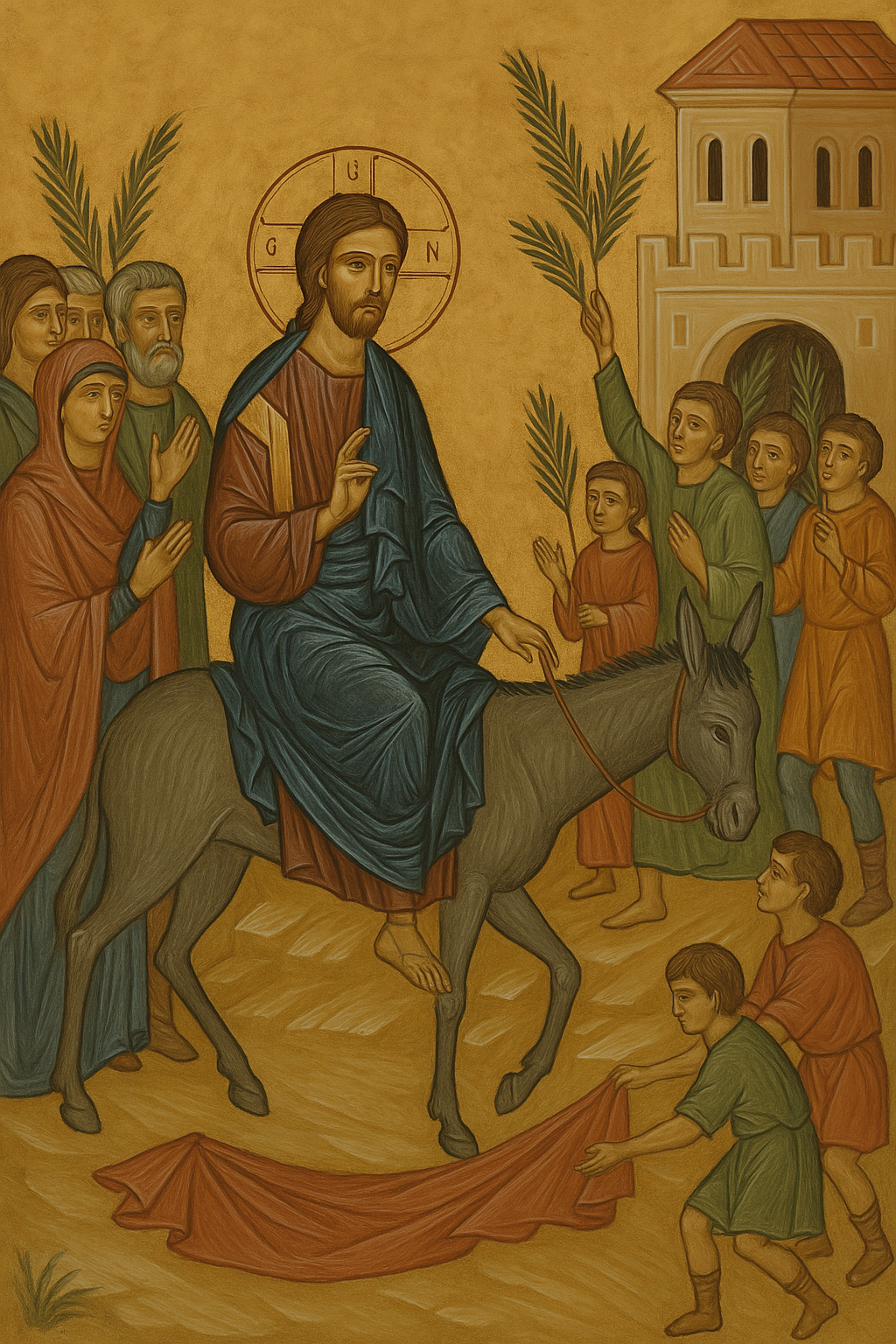 Евангелие рассказывает, что Иисус Христос въехал в Иерусалим на осле, символизируя мир и смирение. Народ, ожидавший Мессию, приветствовал Его радостными криками: «Осанна Сыну Давидову! Благословен грядущий во имя Господне!» Люди стелили свои одежды и пальмовые ветви под ноги Иисуса, признавая Его Царём и Спасителем.