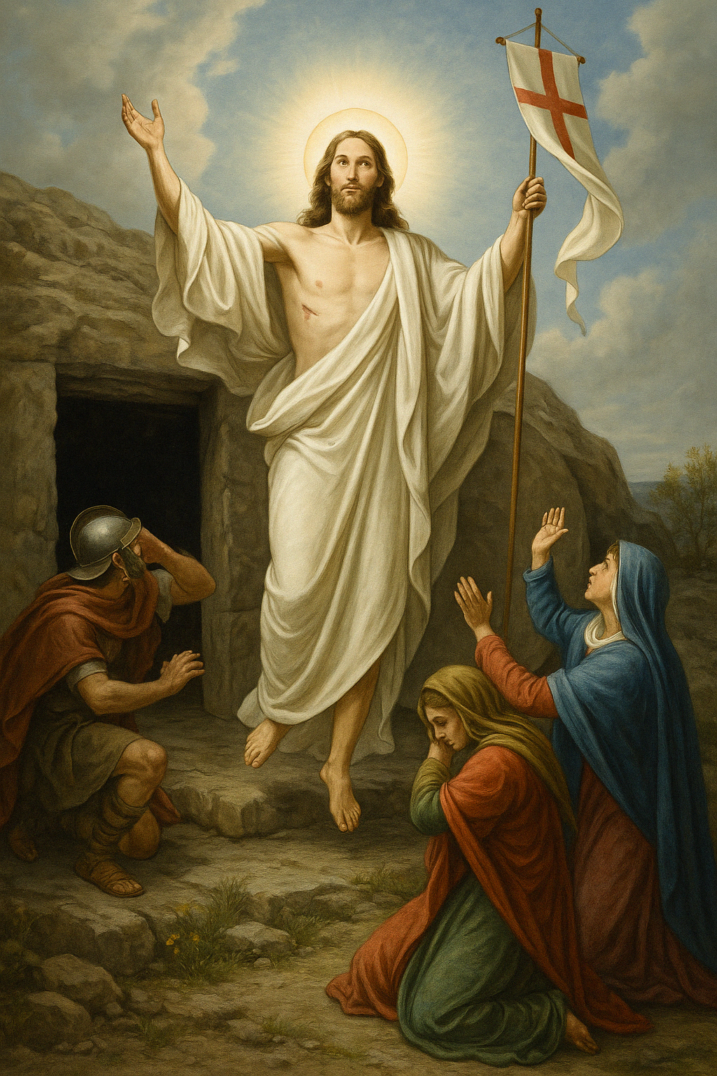 На третий день после распятия Иисуса, когда женщины пришли ко гробу, чтобы помазать Его тело, они увидели камень отваленным, а гроб — пустым. Ангел возвестил: "Его нет здесь — Он воскрес!" (Лк 24:6).