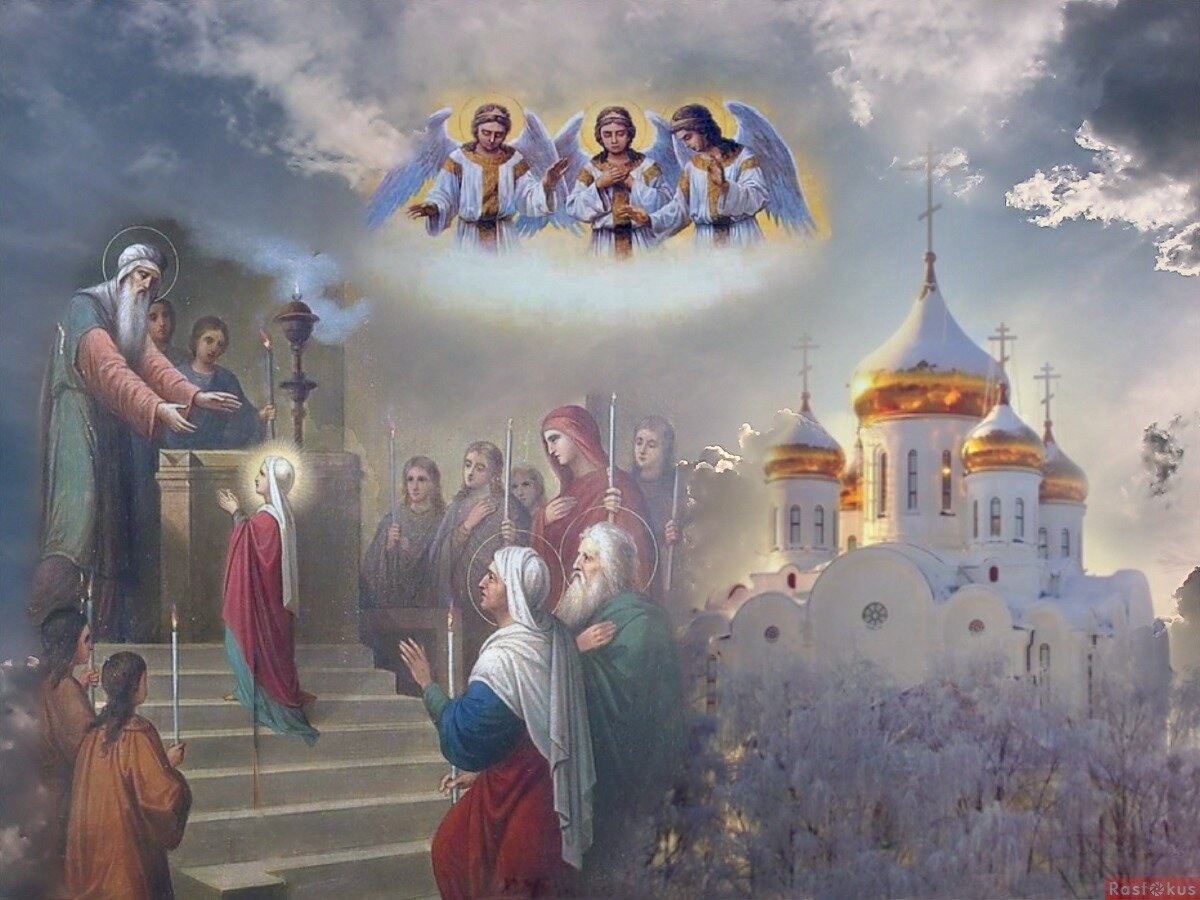 По Преданию, еще до рождения долгожданного ребенка праведные Иоаким и Анна дали обет посвятить своего первенца Богу. Когда их Дочь, Мария, достигла трехлетнего возраста, они решили, что пришло время исполнить данное ими обещание. Иоаким и Анна привели Дочь к лестнице, ведущей ко входу в иерусалимский Храм, наверху которой Ее уже ждал служивший тогда, согласно своей череде, священник Захария – будущий отец пророка Иоанна Предтечи. К его удивлению, трехлетнее Дитя без труда преодолело высокие ступени. Священник взял Деву за руку, вошел с Ней в Храм и по внушению Духа Святого ввел Её в Святое Святых – место, куда только первосвященник входил раз в год для очистительного окропления и воскуривания благовоний. Затем Захария отвел Пречистую Деву в одну из келий, пристроенных к Храму, где возрастали дети, от рождения посвященные родителями Господу. Эта келья стала местом трудов и молитв Девы Марии на следующие двенадцать лет, до достижения ею совершеннолетия. Святитель Димитрий Ростовский, составивший Жития святых, ссылаясь на преподобного Григория Никомидийского, пишет, что Отроковице Марии в келье не раз являлись ангелы и даже приносили Ей пищу. Согласно ветхозаветному Закону, достигшая совершеннолетия девушка должна была быть выдана замуж. Однако Матерь Божья выразила желание сохранить девство, поэтому вместо замужества Она была обручена с пожилым вдовцом – плотником Иосифом из Назарета, который стал хранителем Её благочестия.